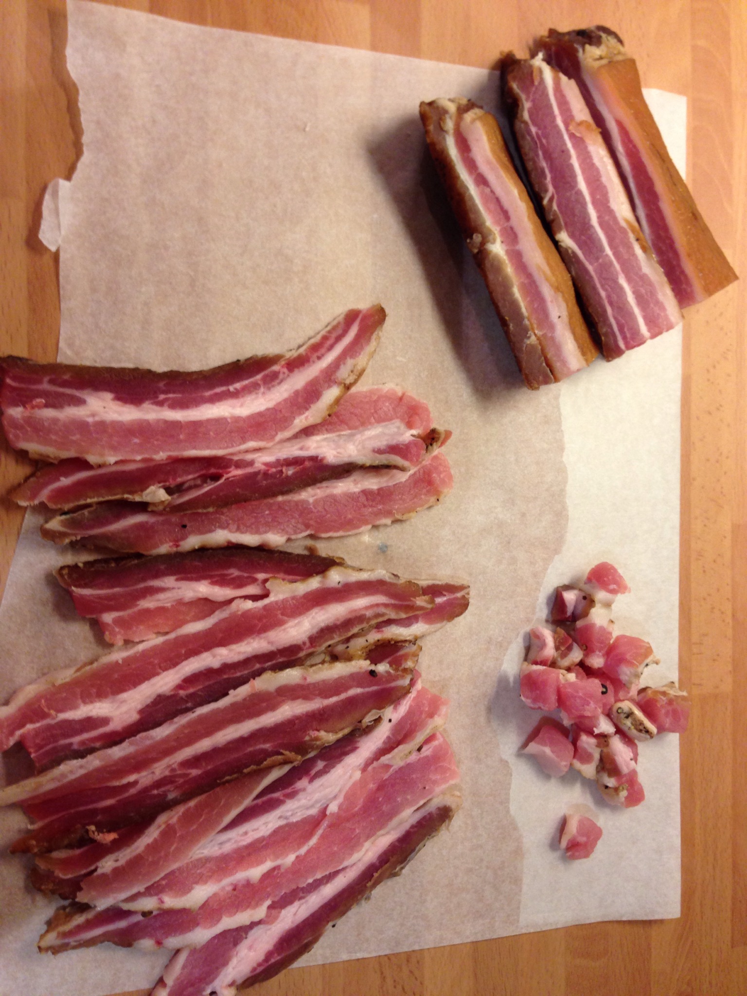 The result was pretty good although maybe a touch salty. I think further experimentation will be required to perfect the cure and use of flavourings. I’ll report back!