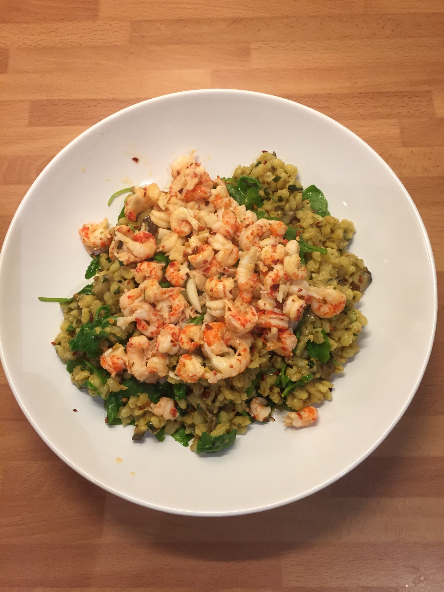Rummaging through my freezer I found some of the barley I had cooked the previous weekend ( this is the cheat bit I guess but you could easily use one of the precooked packets of rice in various flavours you can get from the supermarket) . So I warmed this up and when it was hot took it off of the gas and stirred in some rocket. At the same time I simply tossed some pre cooked crayfish in some hot olive oil with garlic, chilli and squeezed some lime juice on at the end.