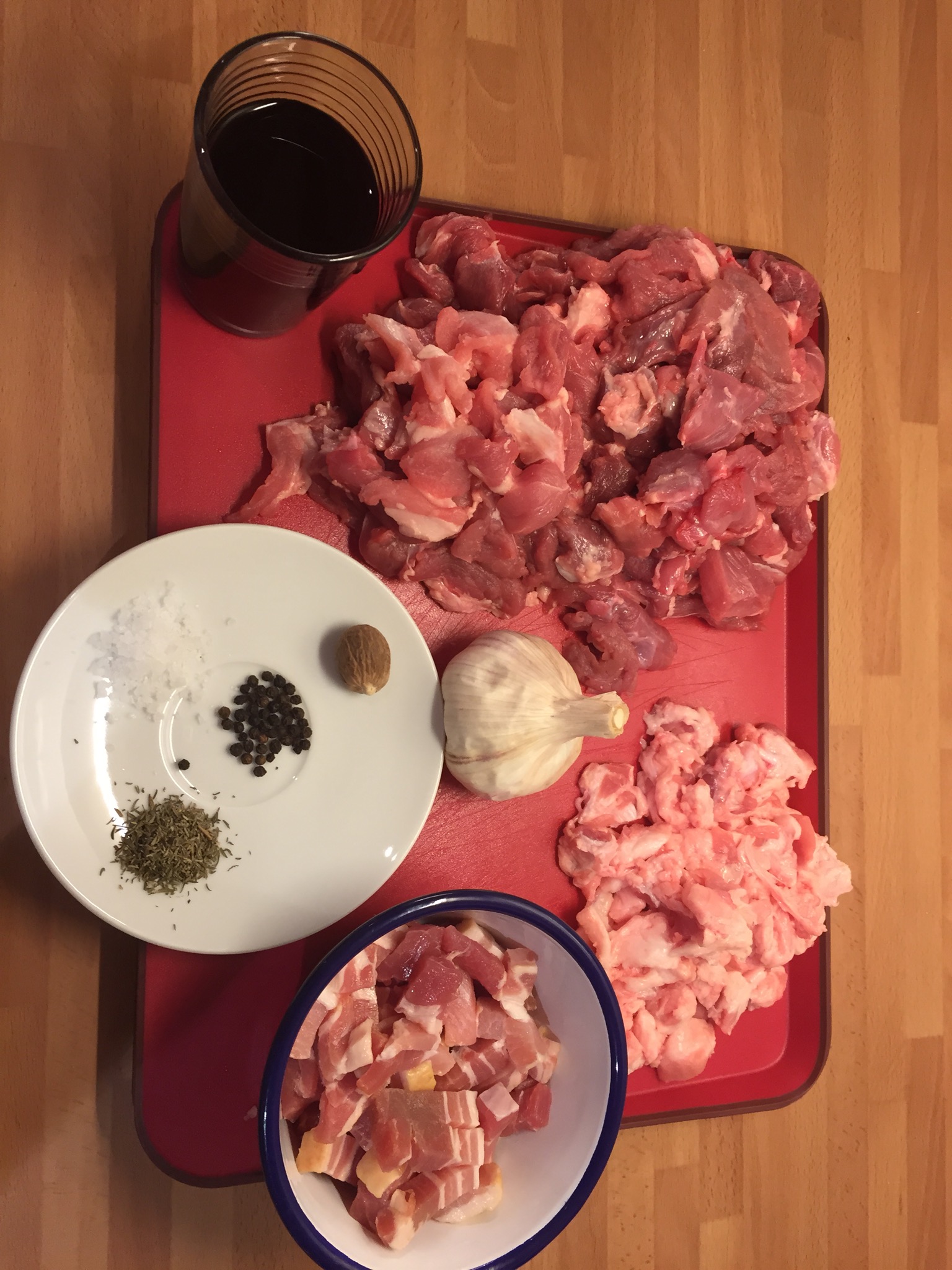 The other ingredients were about half a head of garlic, juniper berries, pepper, nutmeg, salt and some red wine.