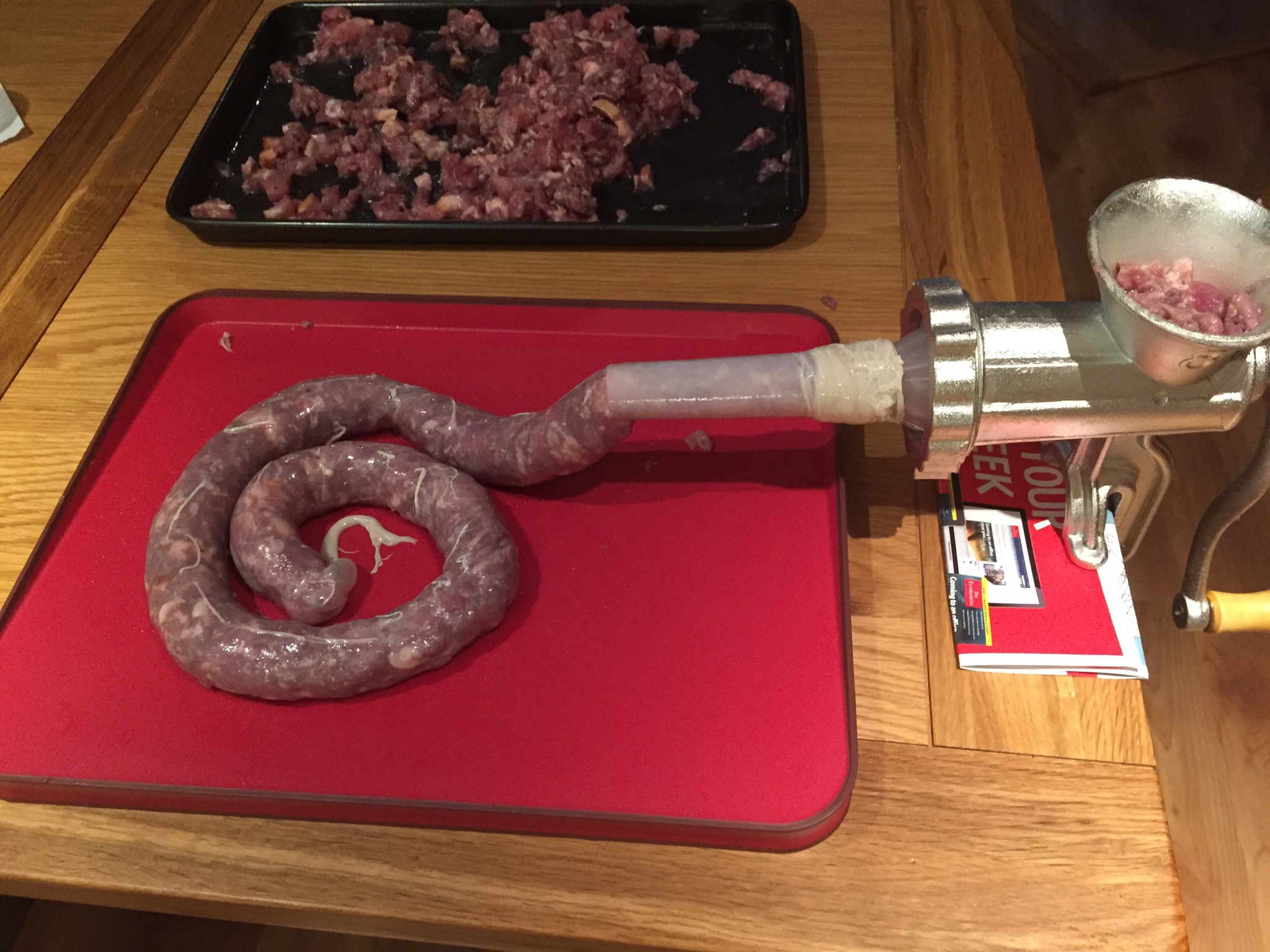 So on with the mincing! I used a reasonably cheap hand mincer which was ok for a while but kept clogging, unfortunately it only had a fine plate and ideally you should use a coarse plate for the right texture. After I had minced half of the meat I hand chopped the rest to keep some bite in the sausage.