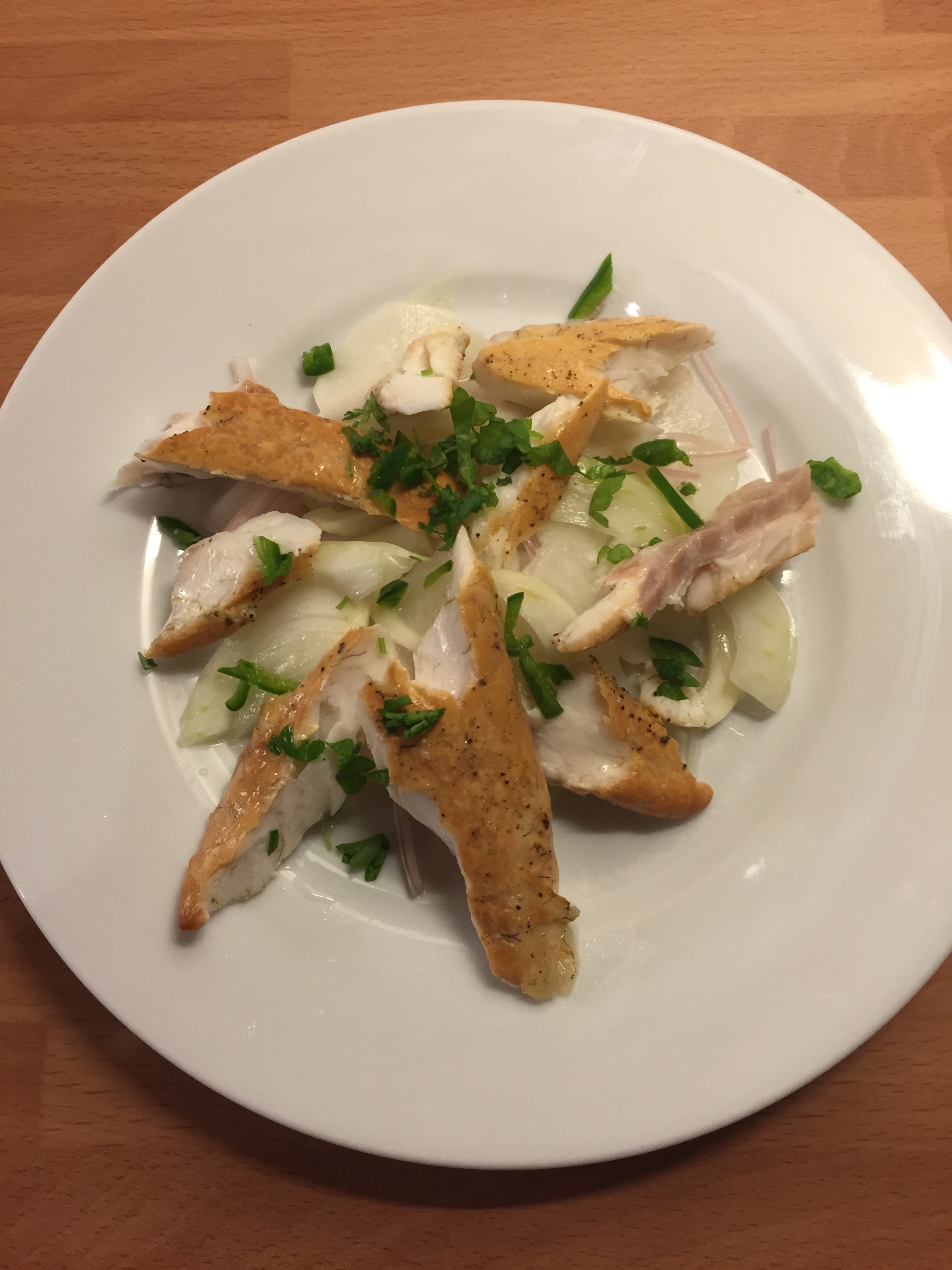 After the smoking I let the fillets cool and flaked them before placing on the salad and drizzling them with lemon juice, coriander and diced green chilli.