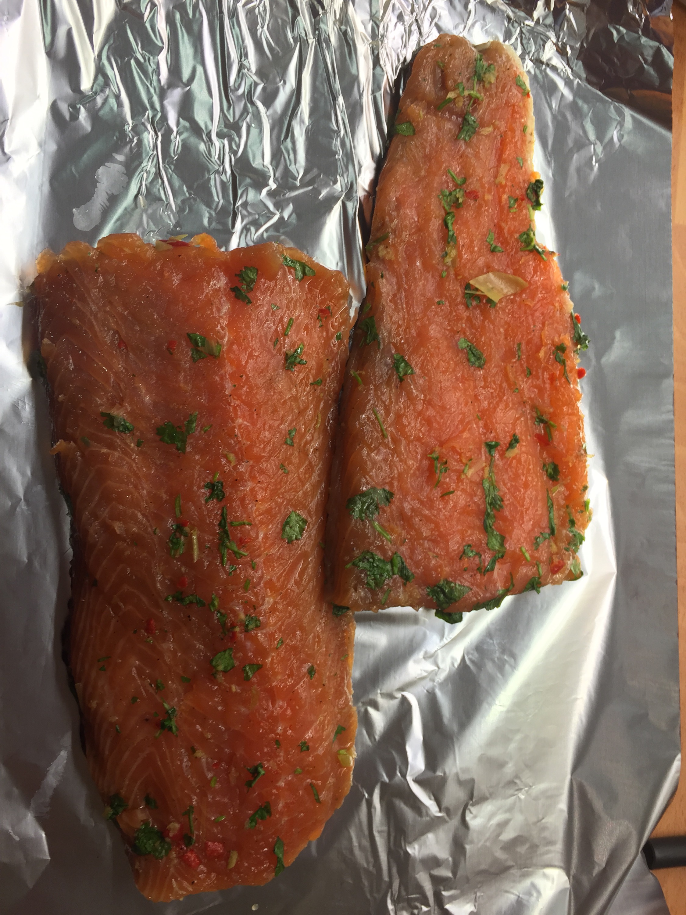 I mixed all the ingredients ( coriander, chilli, ginger, lemon grass, salt and sugar) together then rubbed it into the salmon with some rice wine and let it cure for 3 days.