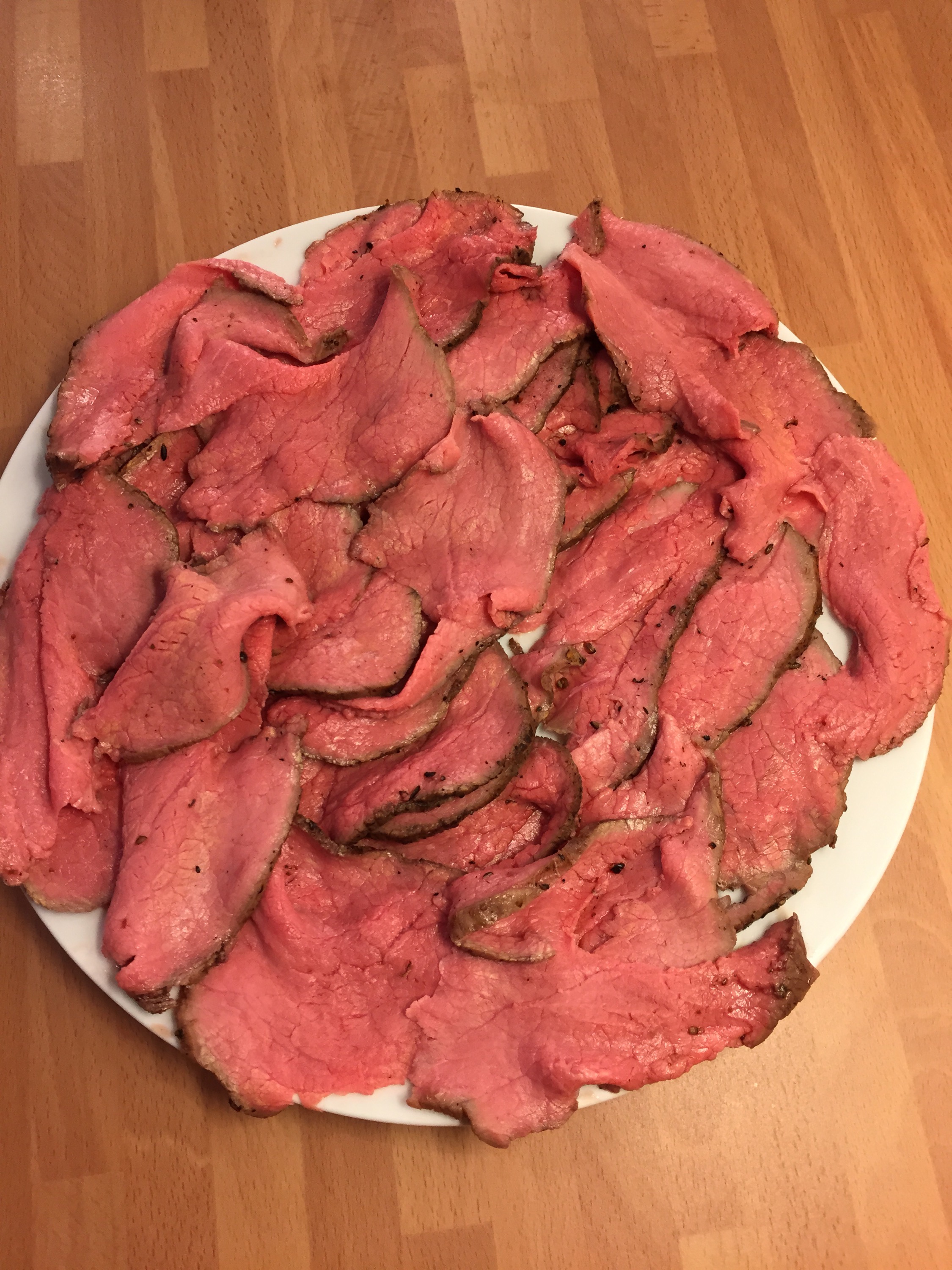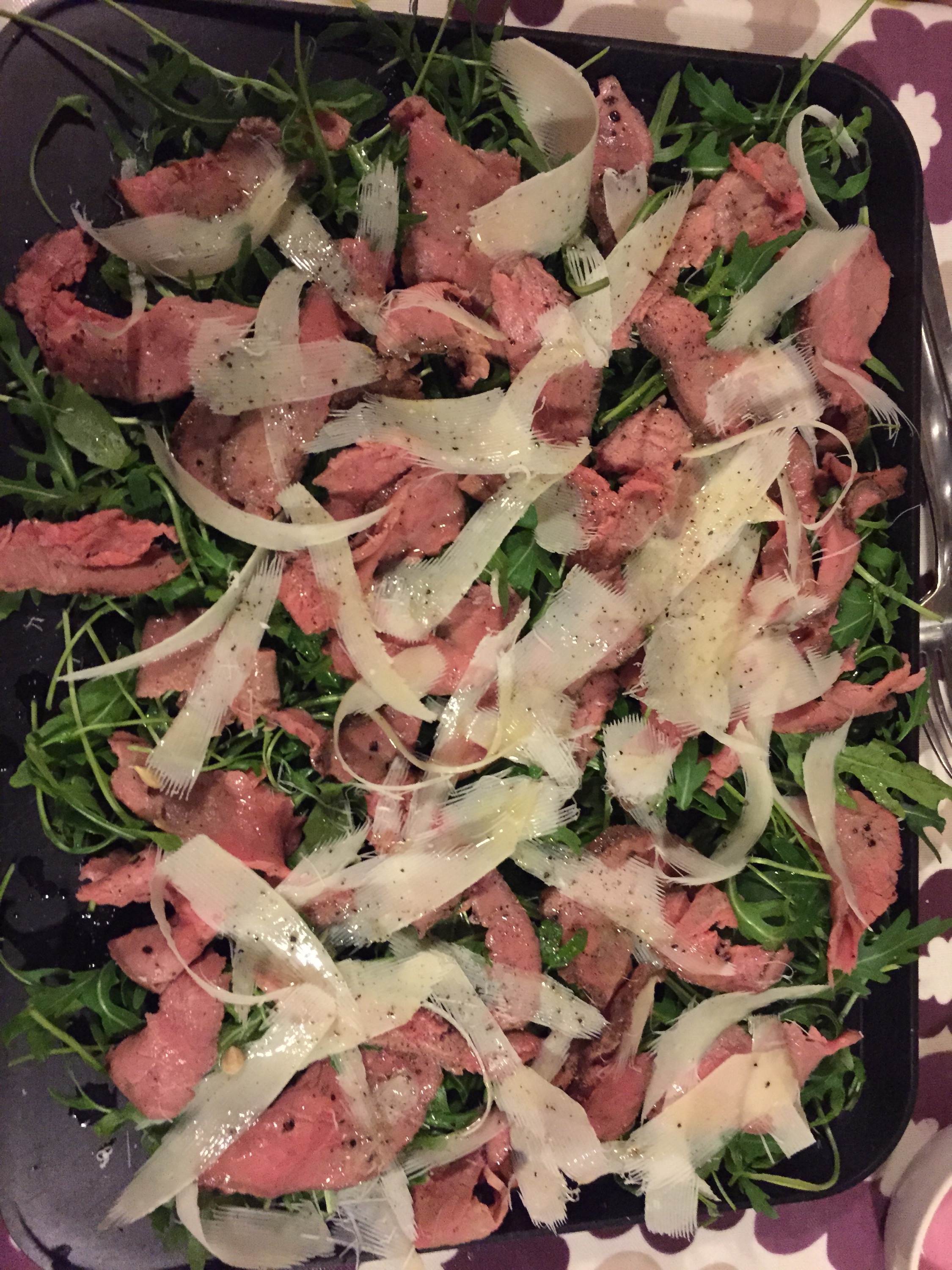 When I arrived at my friends I simply had to assemble the dish on a plate. I laid down a bed of lettuce, put on the beef and then shaved some Parmesan on top and drizzled with lemon juice, olive oil and pepper.