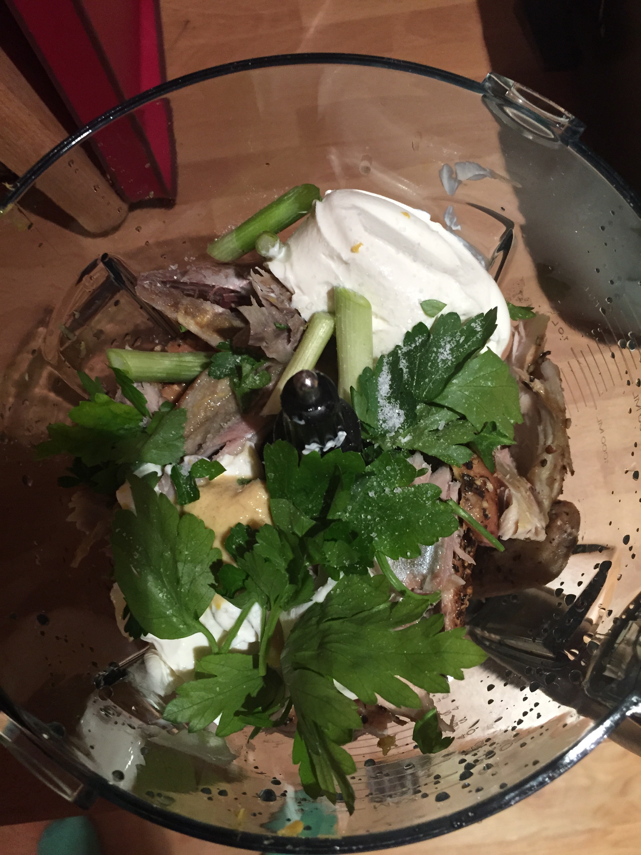 The recipe is so simple. I put four fillets, about 200g of low fat cream cheese, Dijon mustard, the zest and juice of a lemon, spring onions and parsley into a food processor. Then whizzed up till smooth and seasoned to taste.