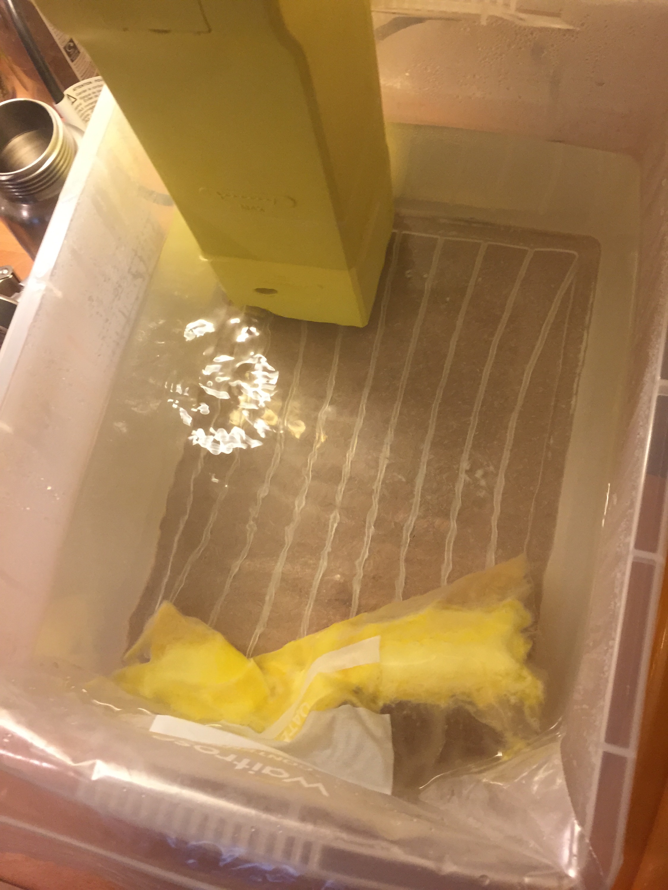 I planned to sous vide some duck eggs and serve them with hollandaise sauce and maple crispy bacon. To make the hollandaise I used a recipe on Chef Steps http://www.chefsteps.com/activities/hollandaise which used the sous vide cooker and a cream whipper but didn’t require any whisking.