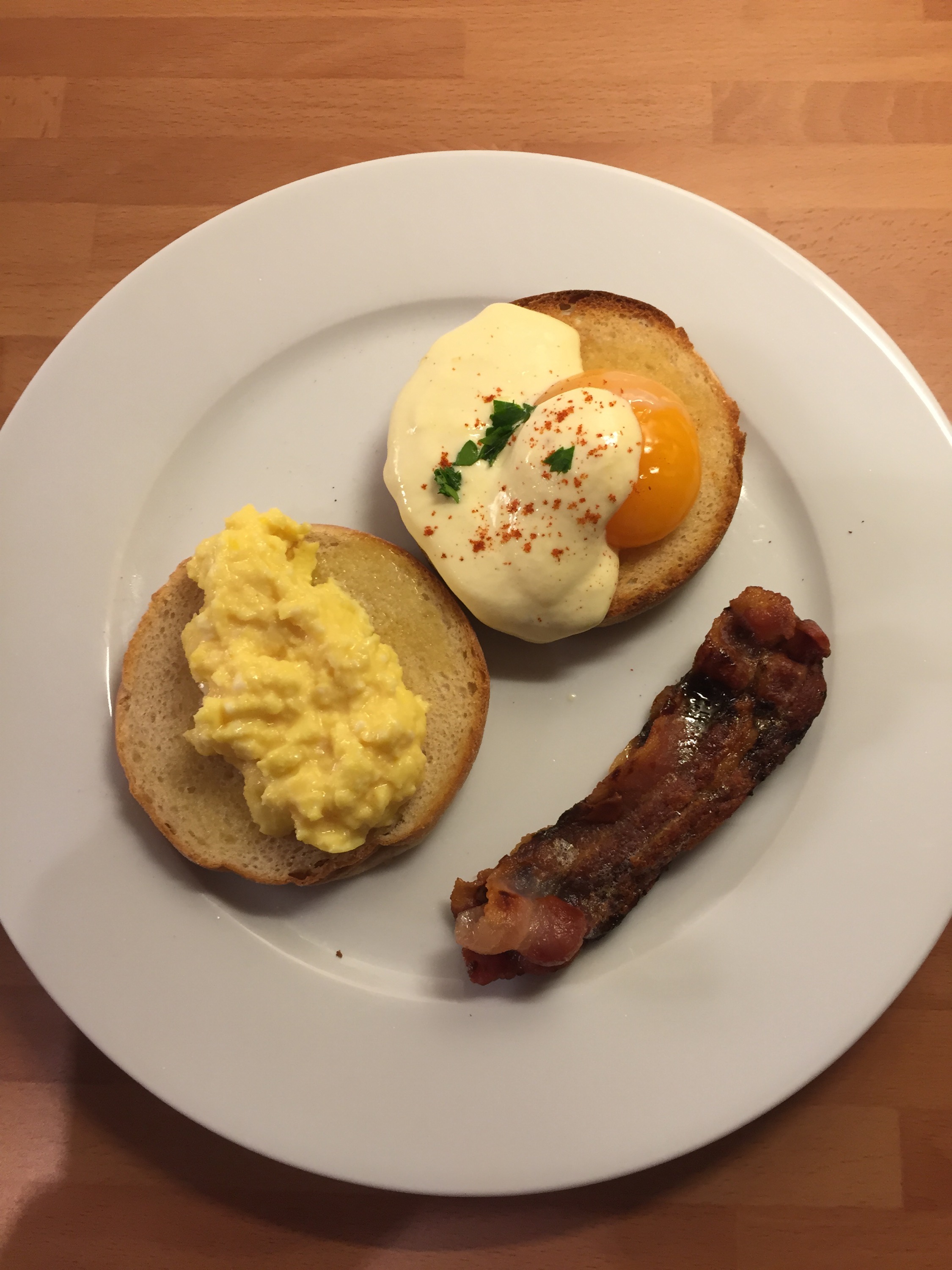 Unfortunately I overcooked the duck egg whites which meant they stuck to the shell, hence I improvised and just served the delicious fudgey yolks and also whipped up some scrambled eggs. I’m going with the improvisation and calling it ‘ duck and hen eggs cooked two ways with maple crisp bacon and hollandaise sauce ‘