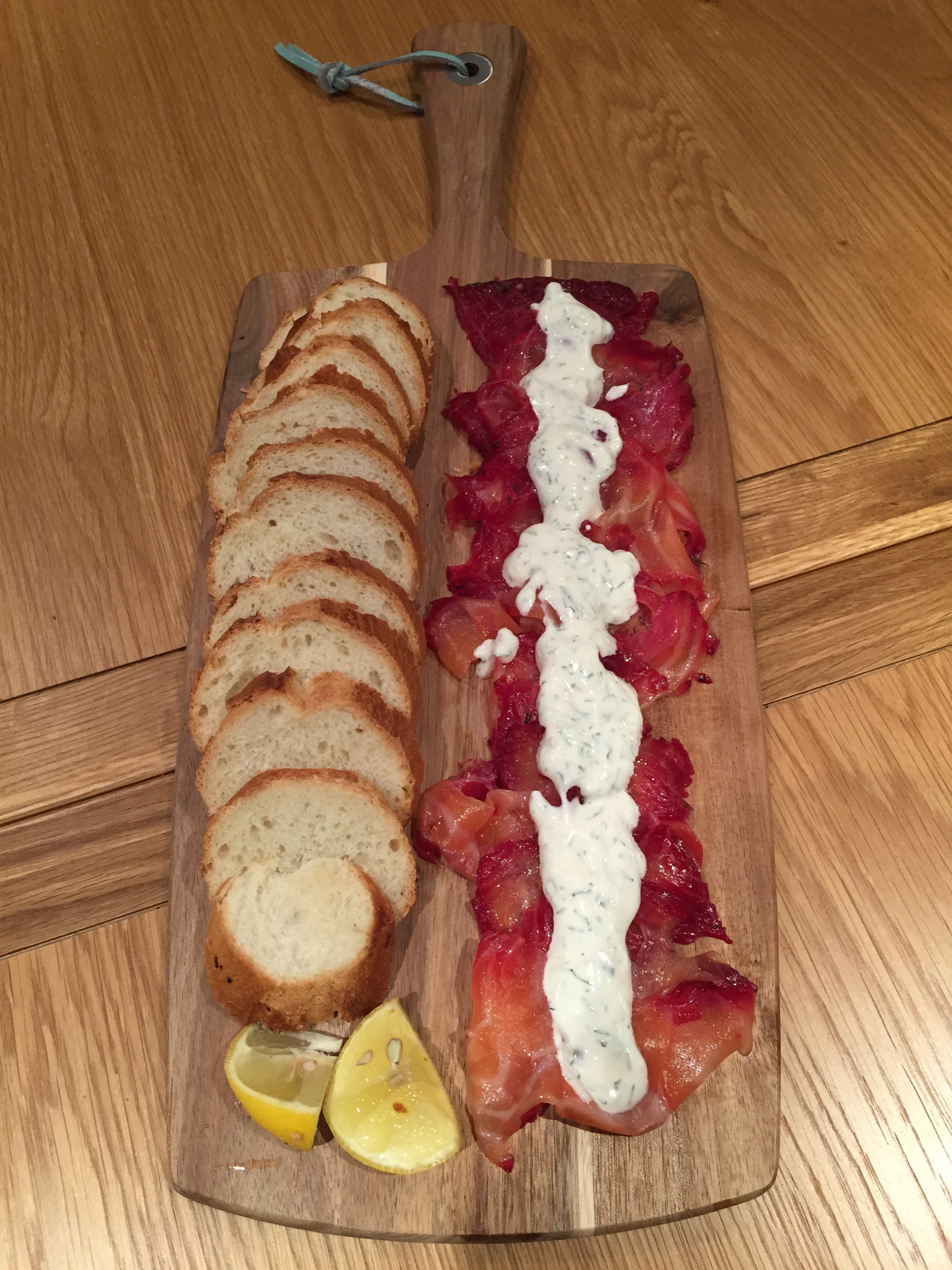 To start with I just used some of my beetroot cured smoked salmon and served it with horseradish, dill and lemon soured cream. This is so tasty I’ve nearly always got some curing I the fridge now.