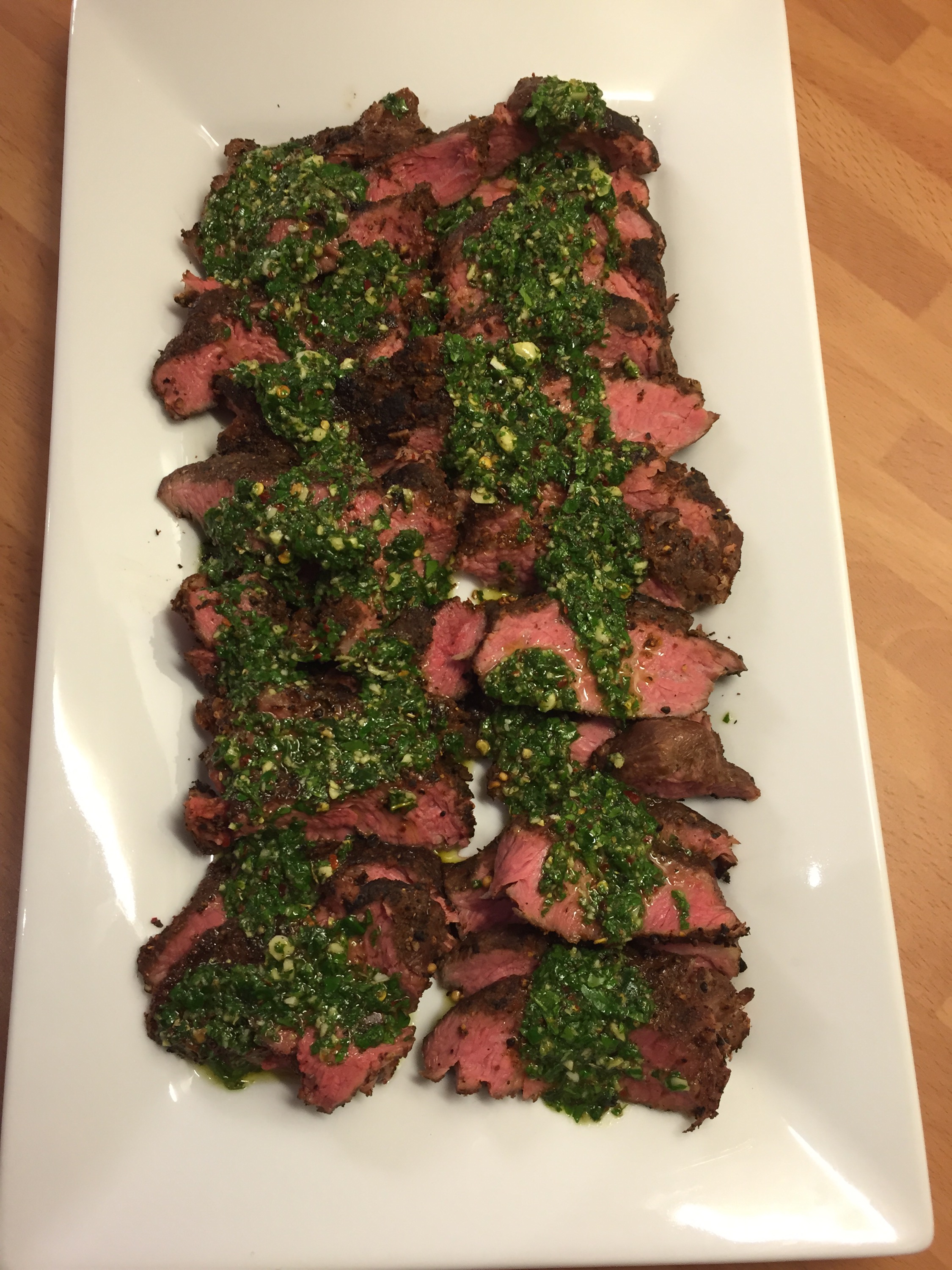 After ten hours I removed the steak from the bag gave it another hit of dry rub and then blasted it with a blowtorch to develop a crust. Then I simply sliced it and served it with some chimichurri sauce.