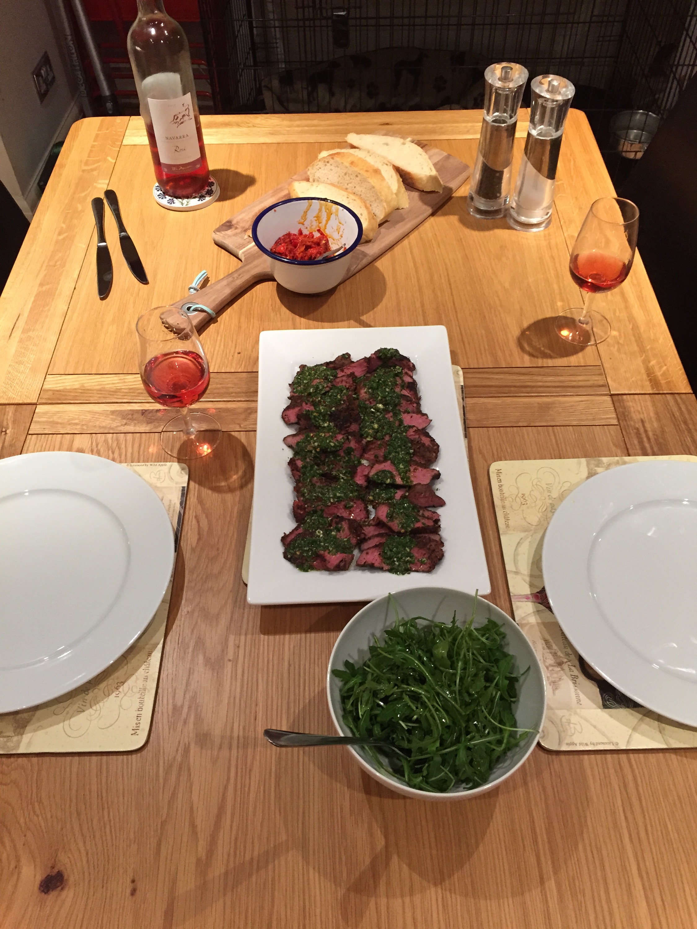 The steak was perfectly medium rare and the sauce was the perfect accompaniment with its wonderful herby , spicy tartness ( find the recipe online here http://www.chow.com/recipes/28393-argentine-chimichurri-sauce ) It’s definitely a dish I’ll be doing again and soon. I served it with some good bread, dressed rocket and some slow cooked Romano peppers. Then we got down to the serious business of smoking cigars and drinking whiskey!