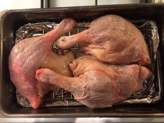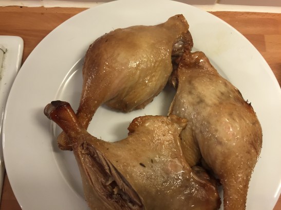Being a food geek I couldn’t just go a smoked duck breast and preferring dark meat I thought I’d buy some legs and smoke them myself in applewood. I cured the duck breasts for two hours in salt, brown sugar and pepper with a little thyme. Then I removed them from the cure washed them and left them in the fridge uncovered overnight to develop a pellicle so the smoke would flavour the meat better. Then the next day it was into the hot smoker for around 30 mins.