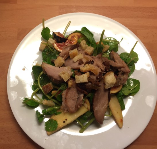 I was wondering what to cook for some friends coming over to dinner and with the apparent emergence of spring ( almost certainly premature and short lived!) I thought I’d start with a salad. I found a recipe online http://www.theguardian.com/lifeandstyle/2012/sep/19/duck-and-fig-salad-angela-hartnett from Angela Hartnett but made a few changes that I’ll outline below!