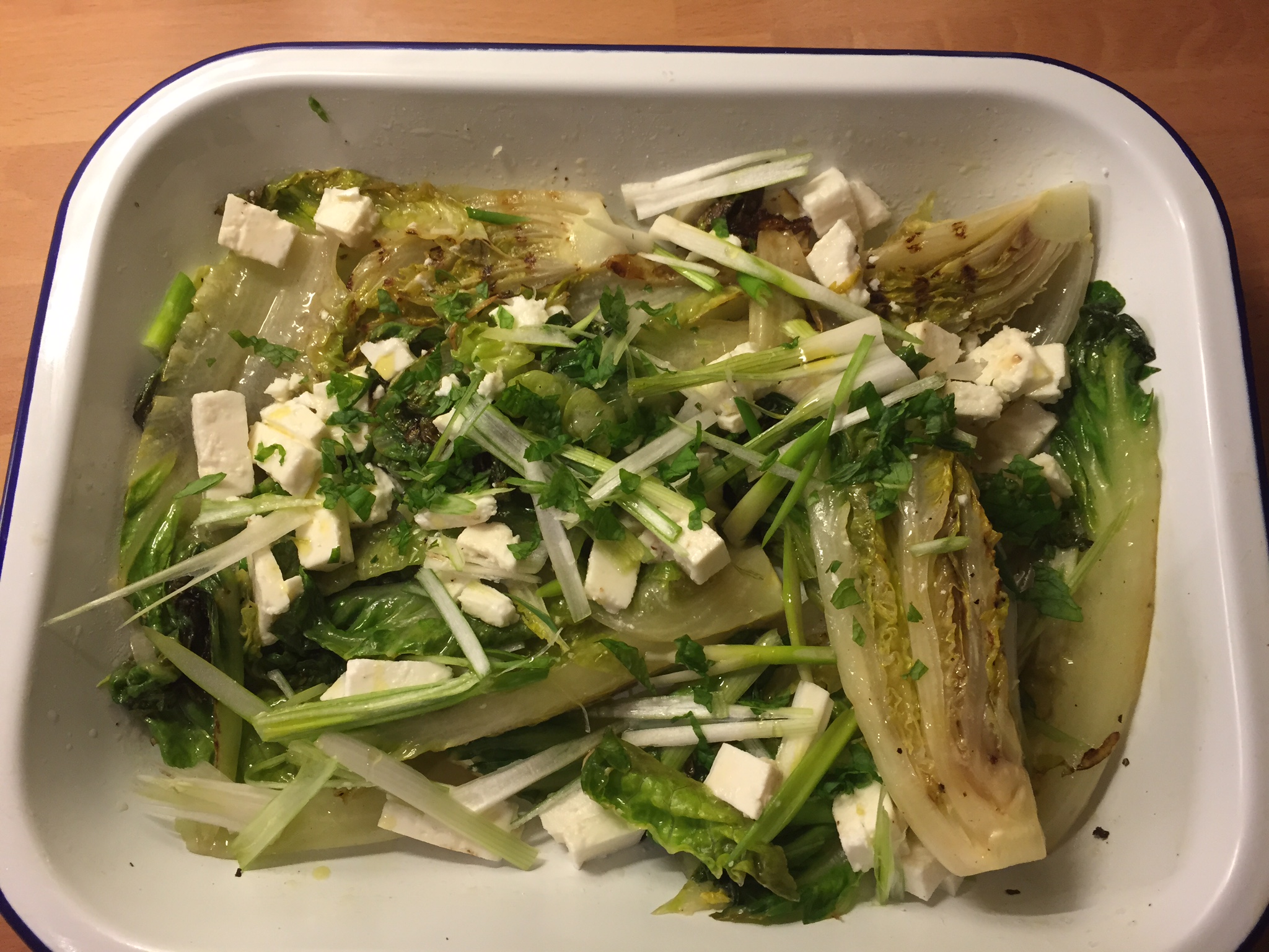 I cut the lettuce into quarters length ways, washed it and then tossed it in olive oil and lemon juice before putting it onto a hot griddle. When there was a bit of charring and the lettuce began to wilt a little i simply put them in a dish added a little more oil and lemon juice as well as salt and pepper and then sprinkled with feta and spring onions. A great side for any barbecue feast.
