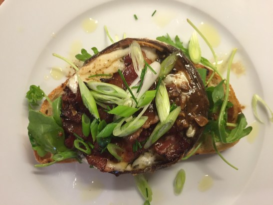 To serve the dish I griddled some sourdough bread, drizzled it with lemon infused olive oil, before layering on a little rocket. When the mushrooms emerged from the oven, a delicious bubbling mass of cheese and bacon, I placed them on the sourdough and rocket base and then garnished with chopped spring onions, chives and the remainder of the sauce.