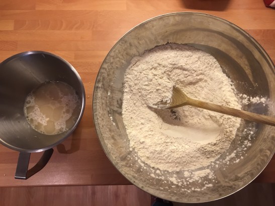 So in the beginning there was flour, sugar, baking powder, milk powder, warm water, yeast and vegetable oil.
