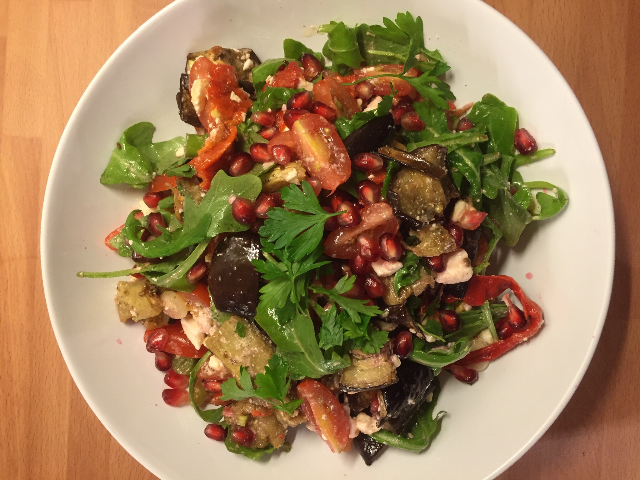 When all this was combined in a bowl I added olive oil, lemon juice and salt and pepper and made sure all of the salad was coated before throwing in the pods of half a pomegranate.
