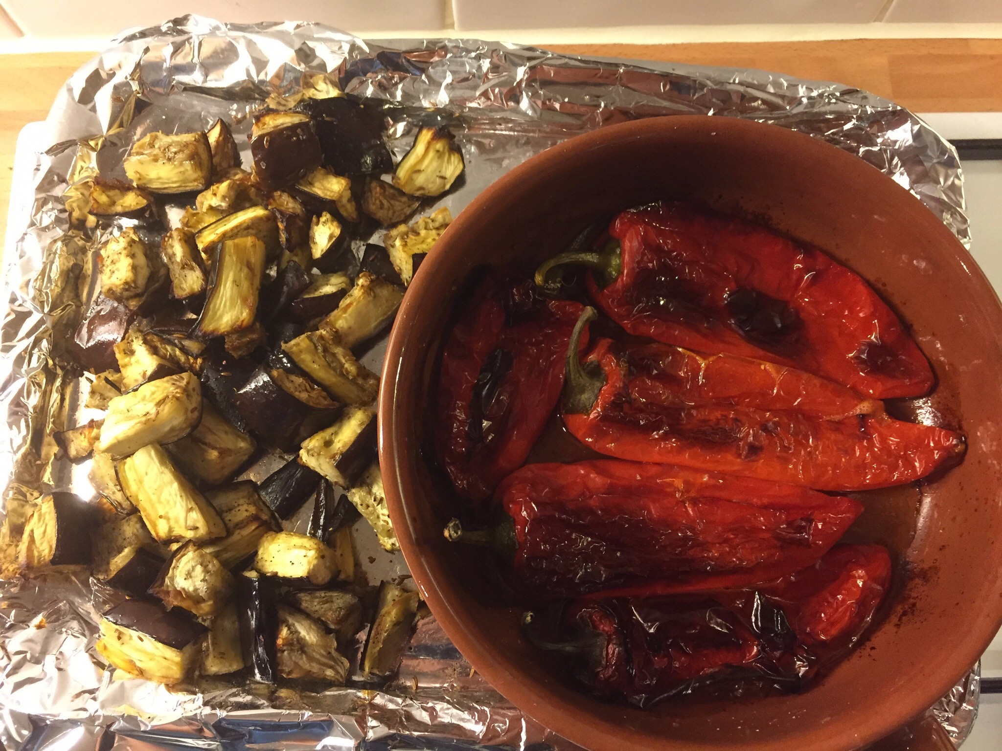 To begin with i cubed some aubergine and sprinkled with cumin, salt and olive oil and then roasted for about 40 minutes at 200c, at the same time i also put some peppers into roast.