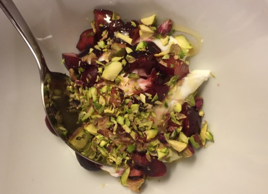 So all I did was add chopped pistachios, halved cherries and orange blossom honey to a good dollop of thick creamy Greek yoghurt. In fact it probably took less than two minutes but tasted great.