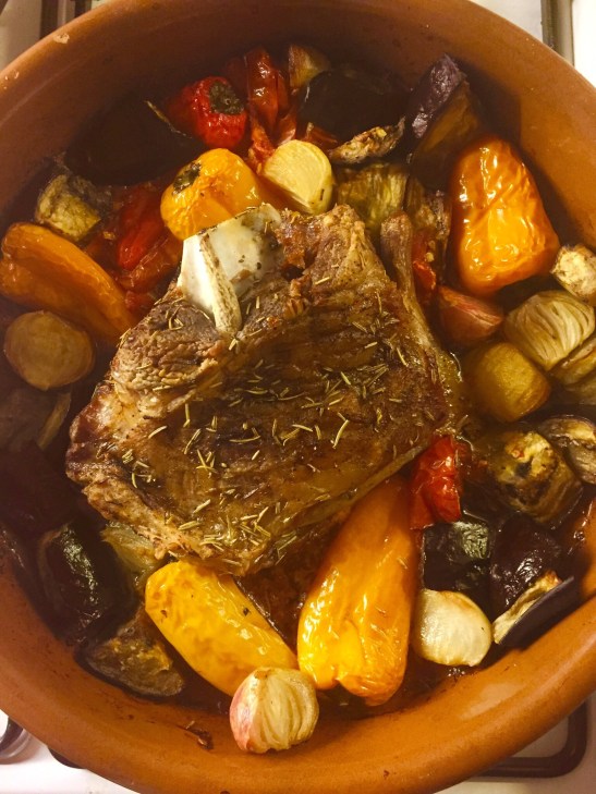 After four hours I put the vegetables in with the lamb, removed the cover and added a little olive oil, then returned it to the oven for about an hour. You can tell when the vegetables are cooked when the aubergine is tender.