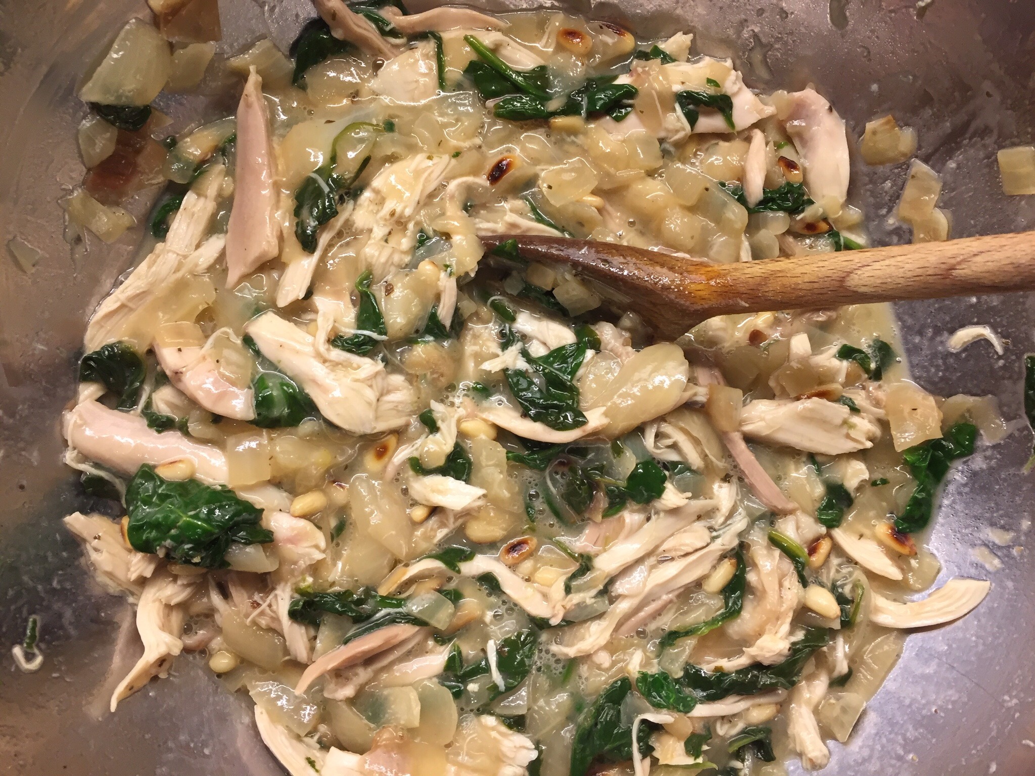 At this stage you should also boil the cooking liquid hard and reduce it by at least half to make a delicious stock and allow to cool. To assemble all of the filling I added three beaten eggs to the chicken, onions, pine nuts, spinach and then poured in enough stock to make a wet mixture, then mixed well.
